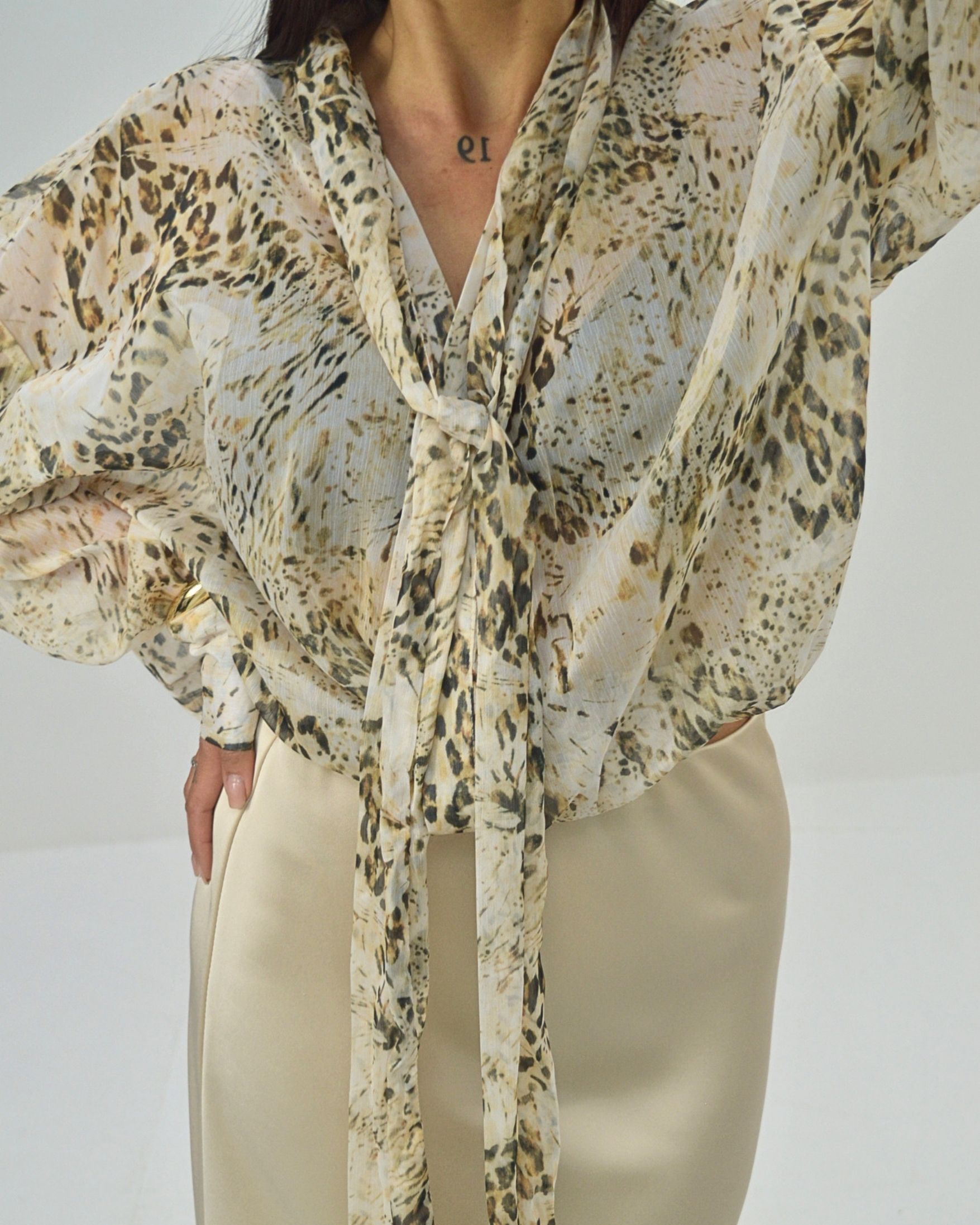 Camicetta leggera in tessuto fluido con stampa animalier. Modello a maniche lunghe ampie, scollo a V con laccetti da annodare sul davanti. Vestibilità morbida. Elastico sulla fine.