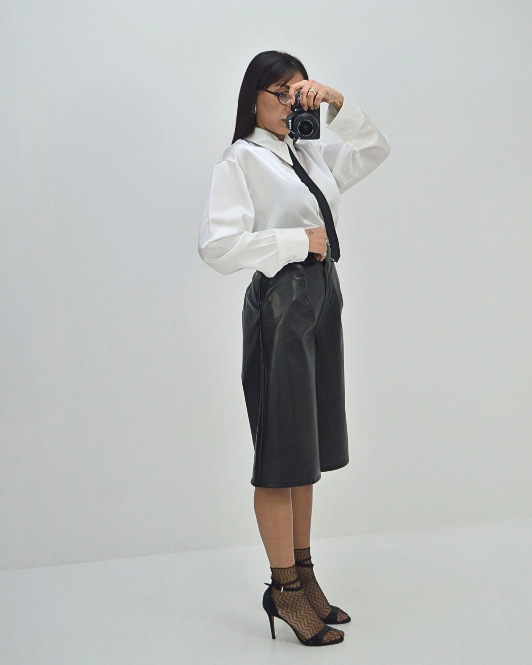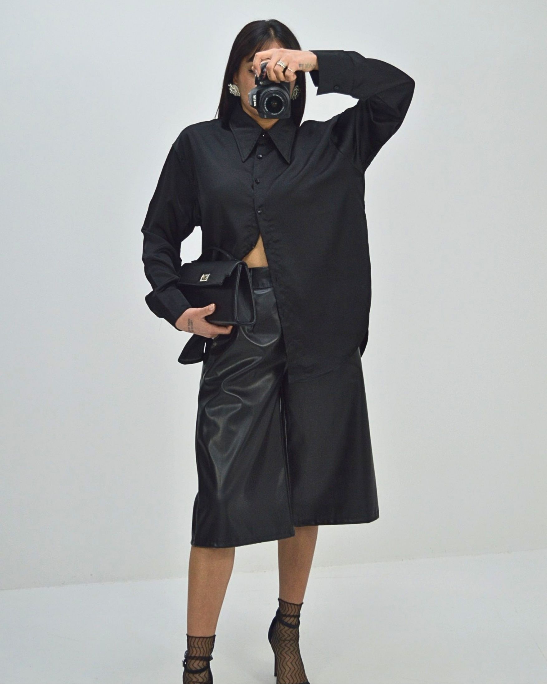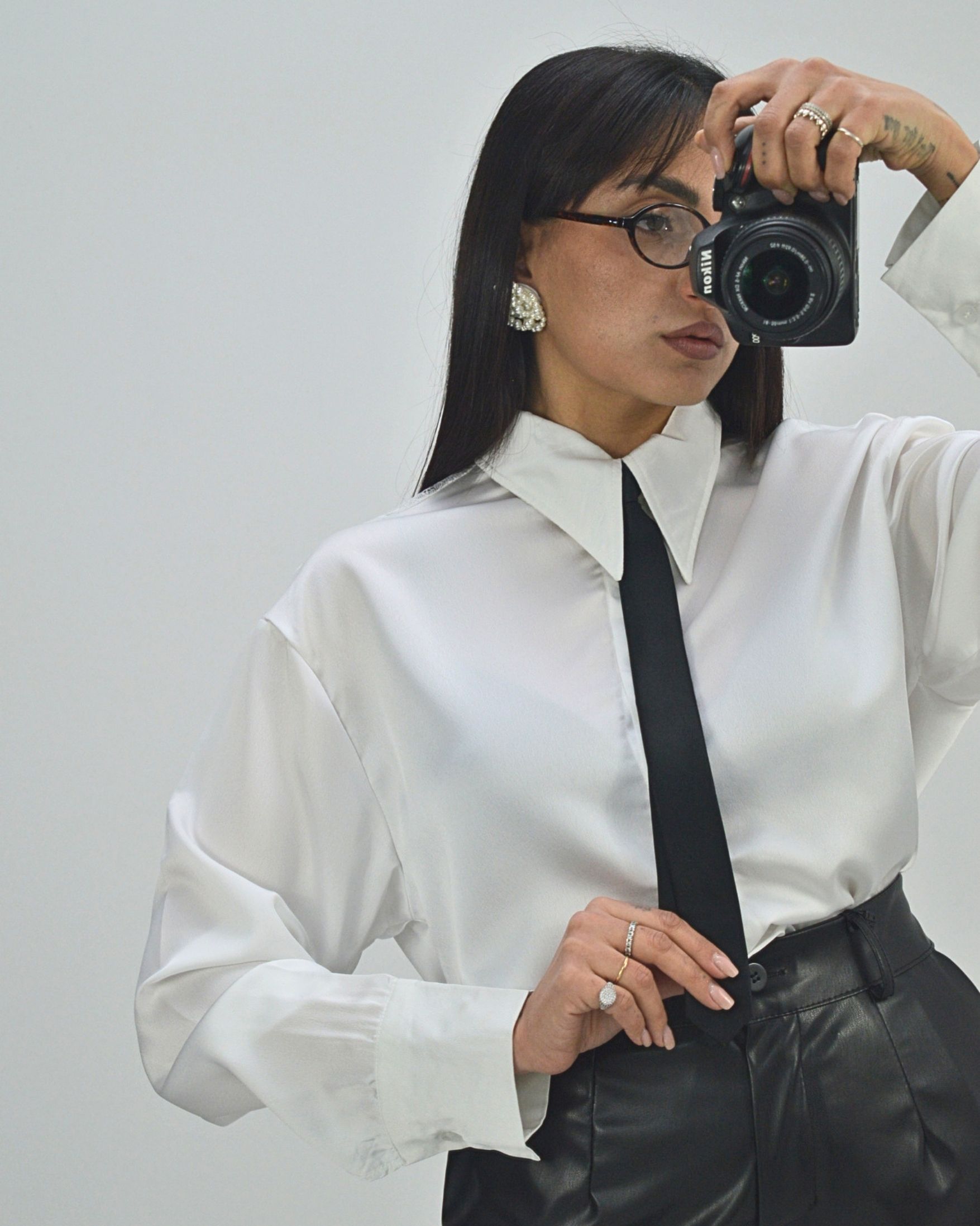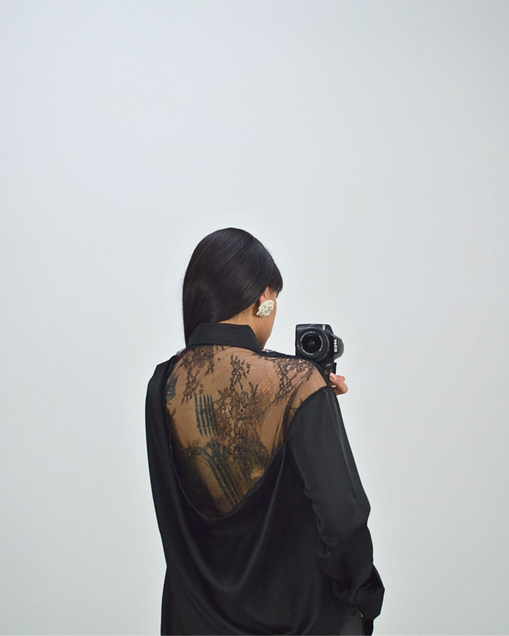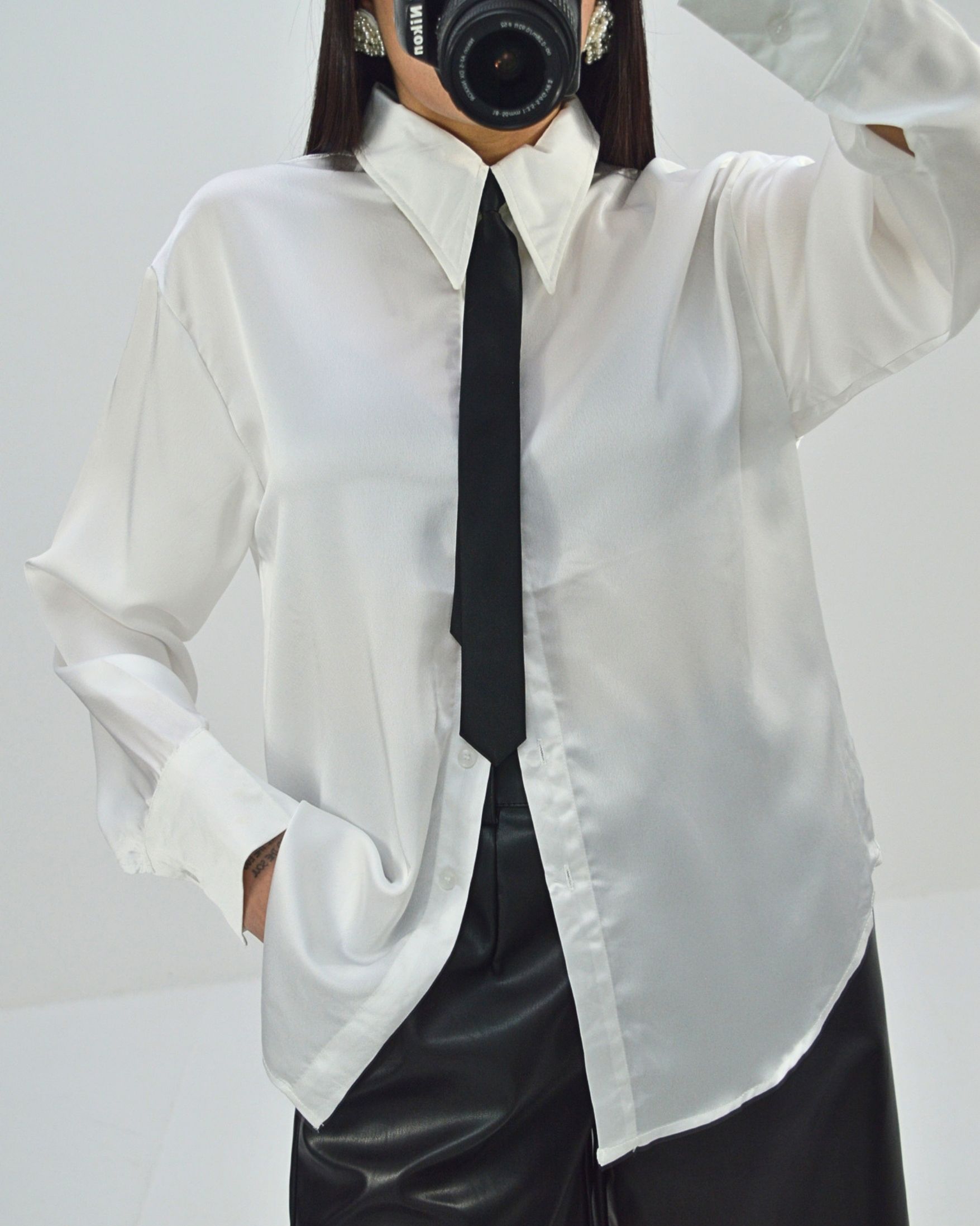 Camicia fluida realizzata in tessuto satinato dalla finitura lucida. Il modello presenta un collo a revers e maniche lunghe con polsino alto. Retro con un ampio inserto in pizzo semitrasparente con ricami floreali.