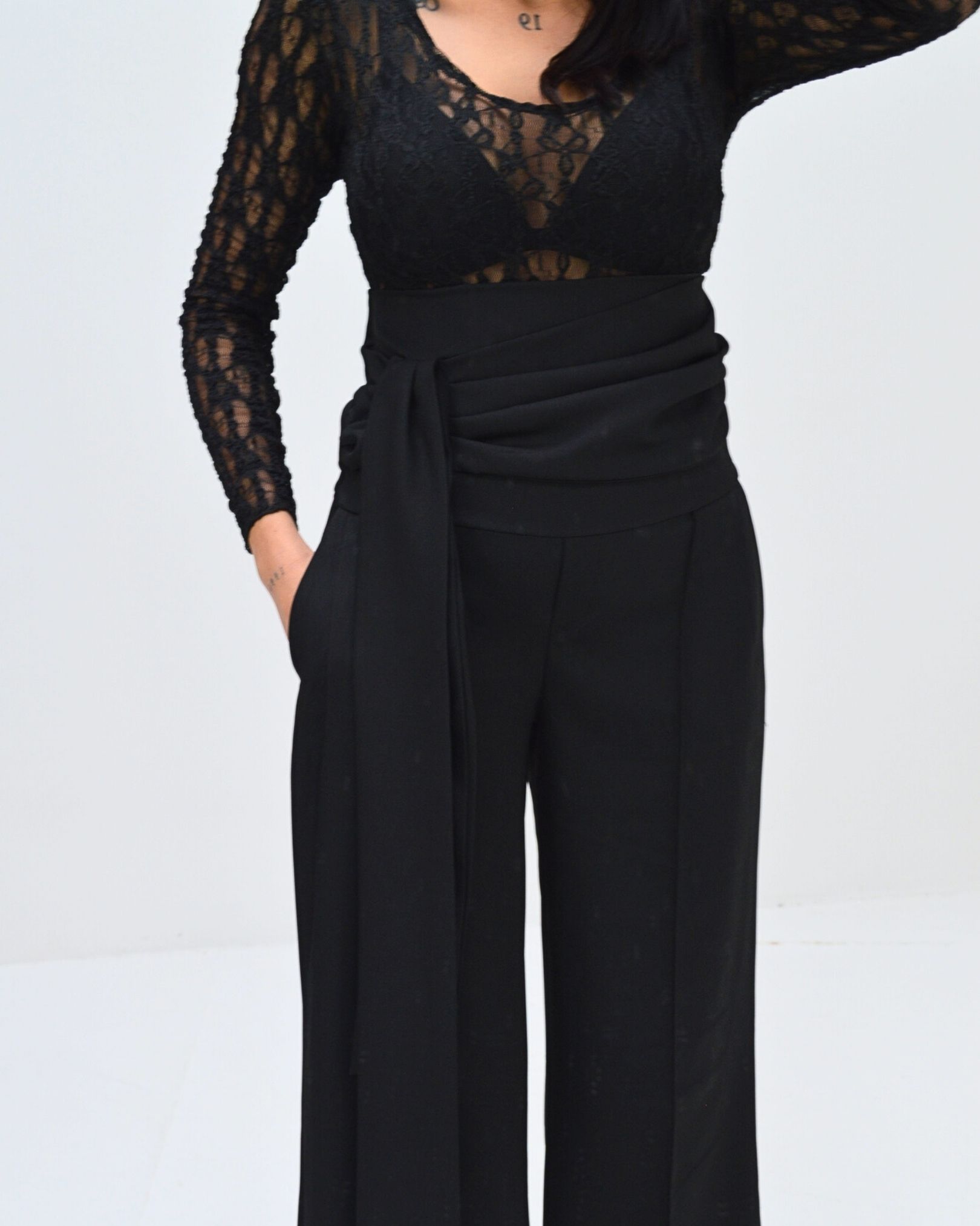 Pantalone dal taglio fluido e sartoriale, caratterizzato da una silhouette a gamba larga che enfatizza il movimento. Il design è focalizzato sulla vita alta, definita da una fascia coordinata. Chiusura posteriore con cerniera.