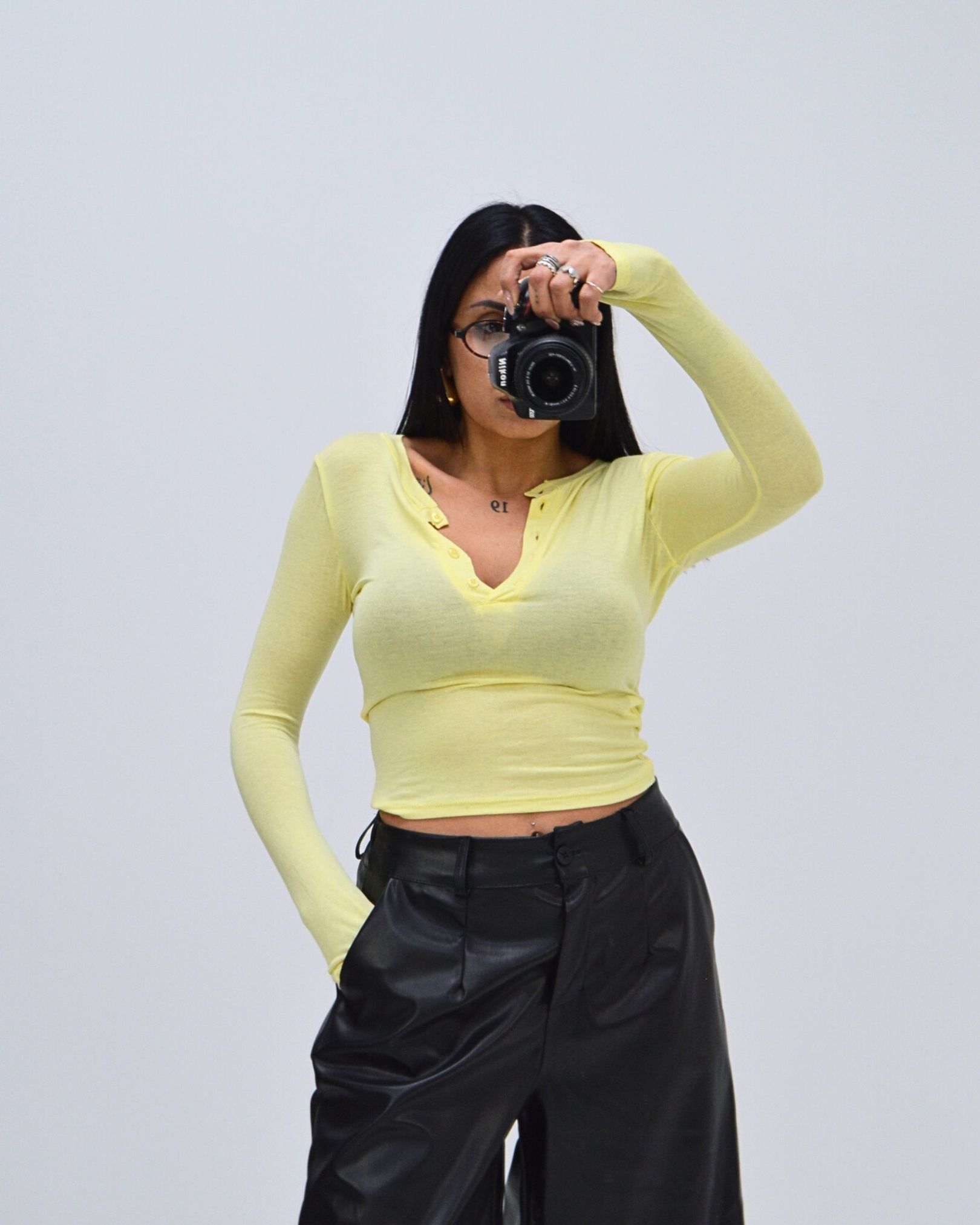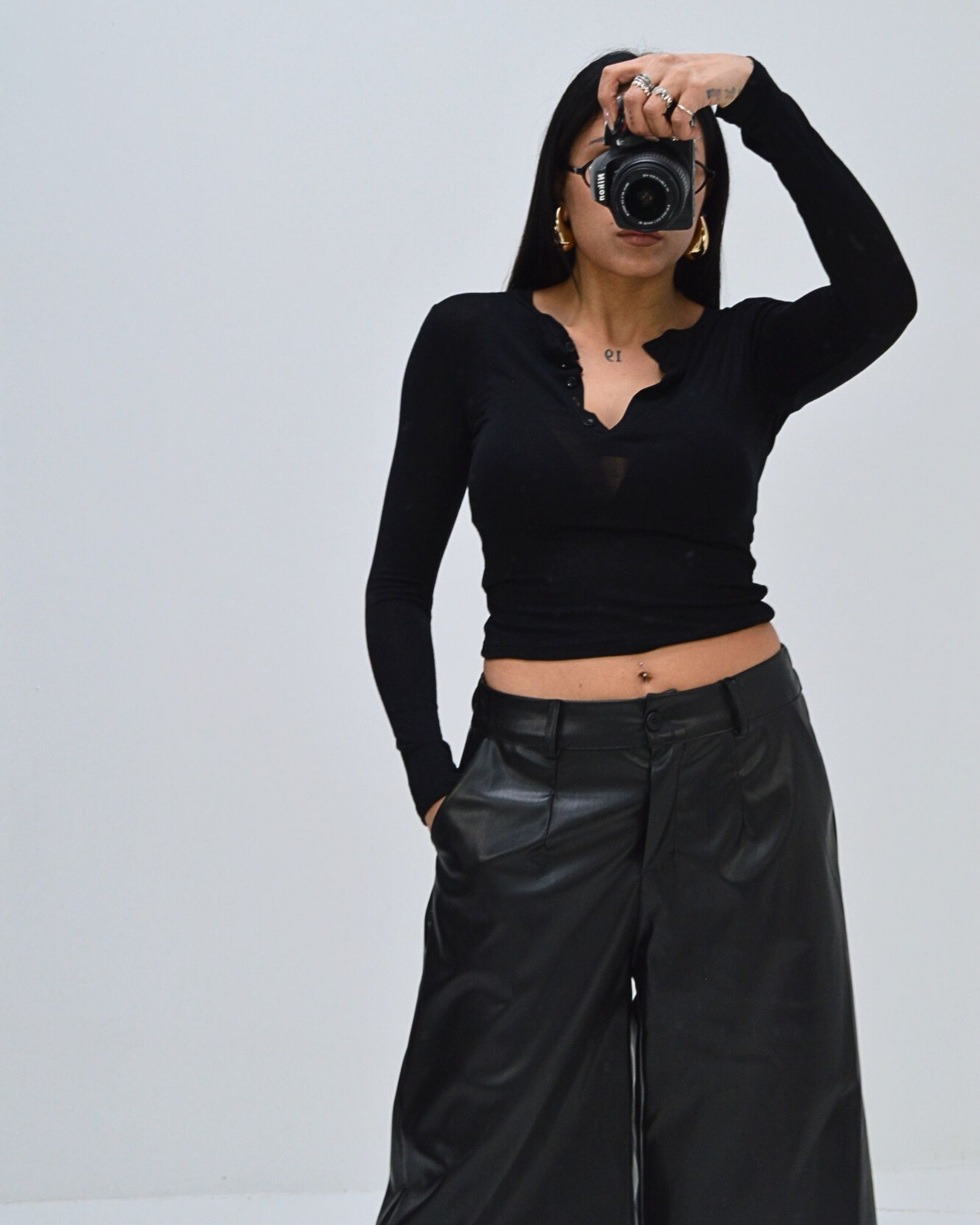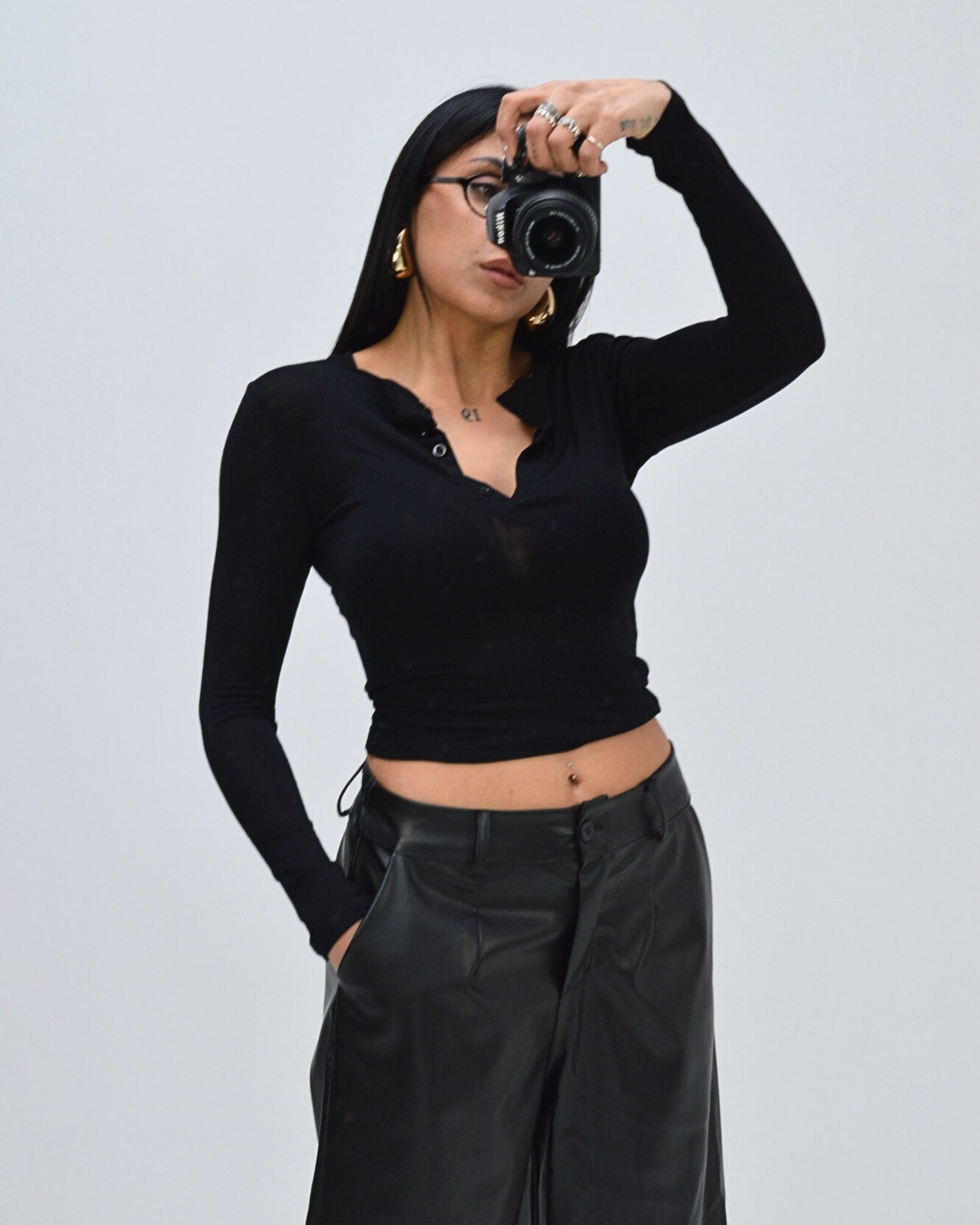 T-shirt aderente a maniche lunghe realizzata in tessuto elasticizzato. Modello crop con scollo a V e chiusura frontale con piccoli bottoni tono su tono.